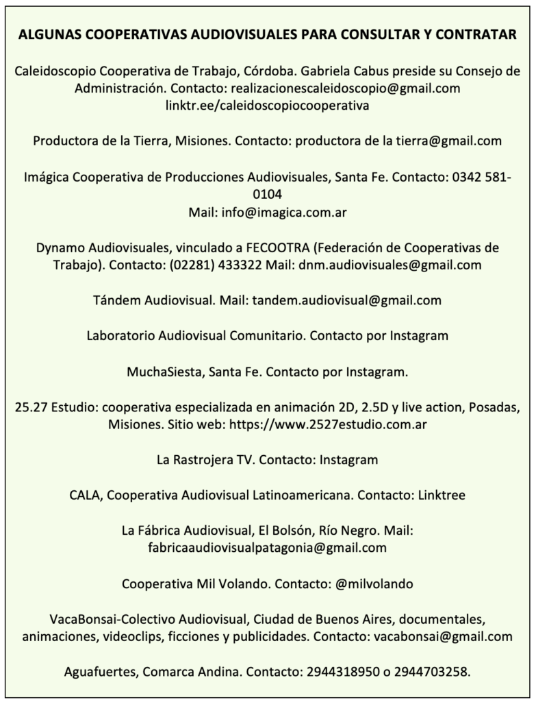 En tiempos de retracción del mercado, conflictos laborales y debilitamiento de las políticas públicas de fomento, la cooperativa es una forma vigente por ley y muy eficaz para producir, asociarse, acceder a derechos y sostener el trabajo audiovisual. Se puede construir una cooperativa de trabajo nueva desde cero o bien contratar una de las cooperativas existentes en todo el país y con toda su estructura legal en funcionamiento.